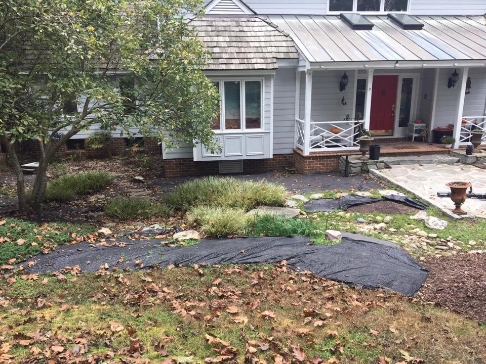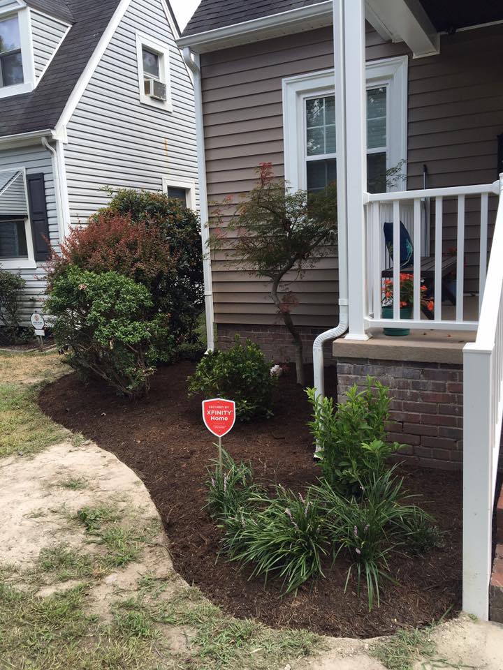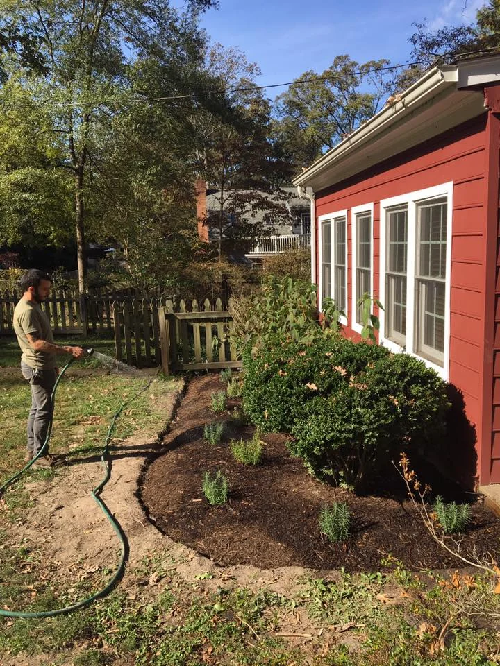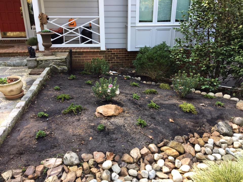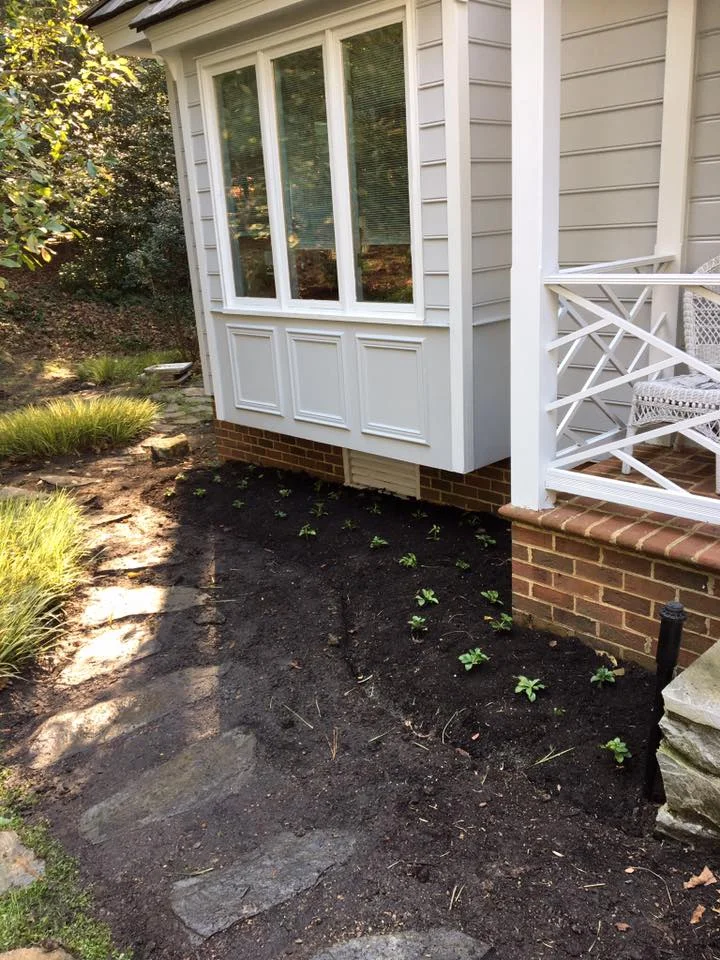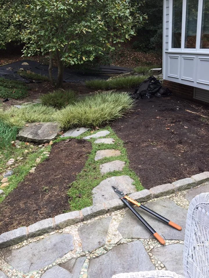 FRONT BED PREP, EDGING, AND MULCHING. NATIVE PLANT INSTALLATION AND FLAGSTONE WALKWAY IN BACKYARD FROM CAR PORT TO BACK PORCH.